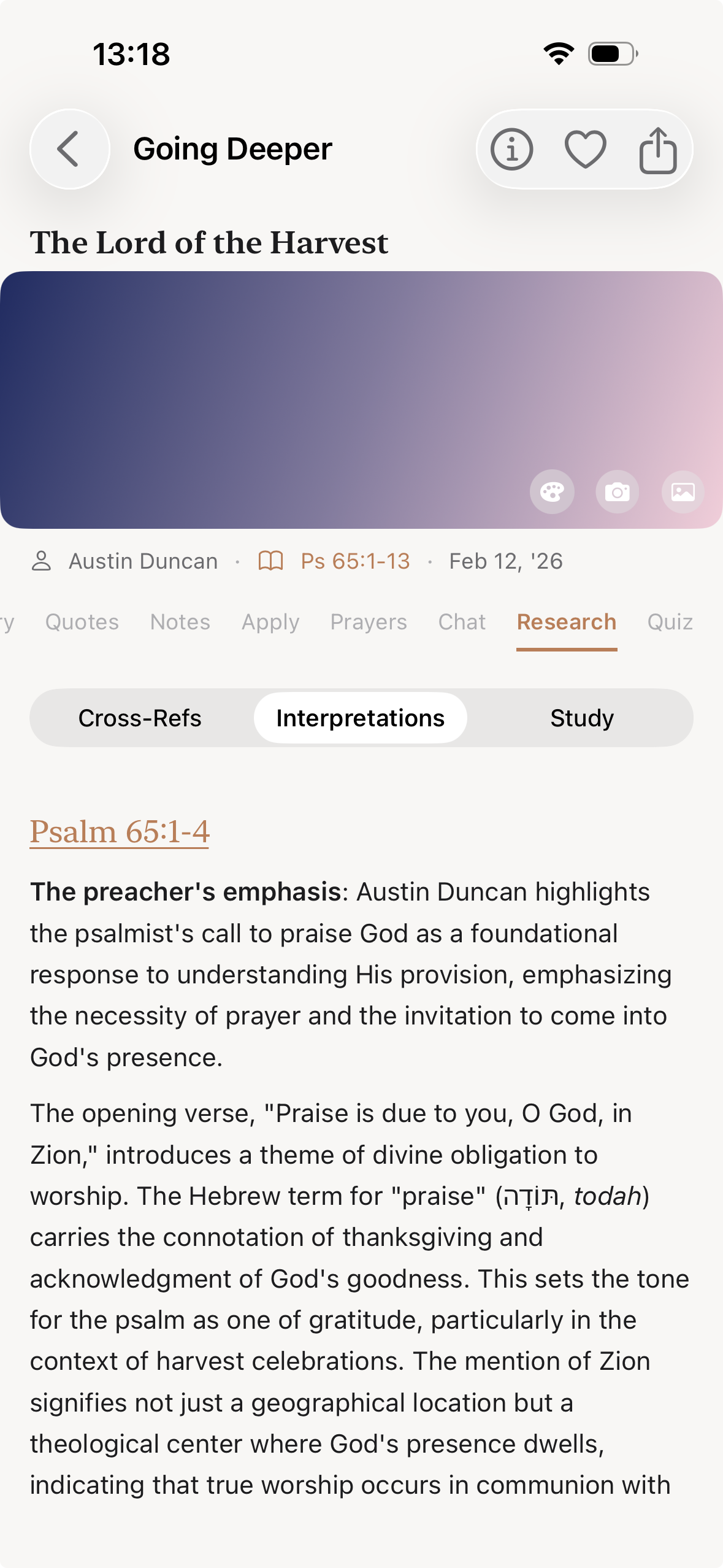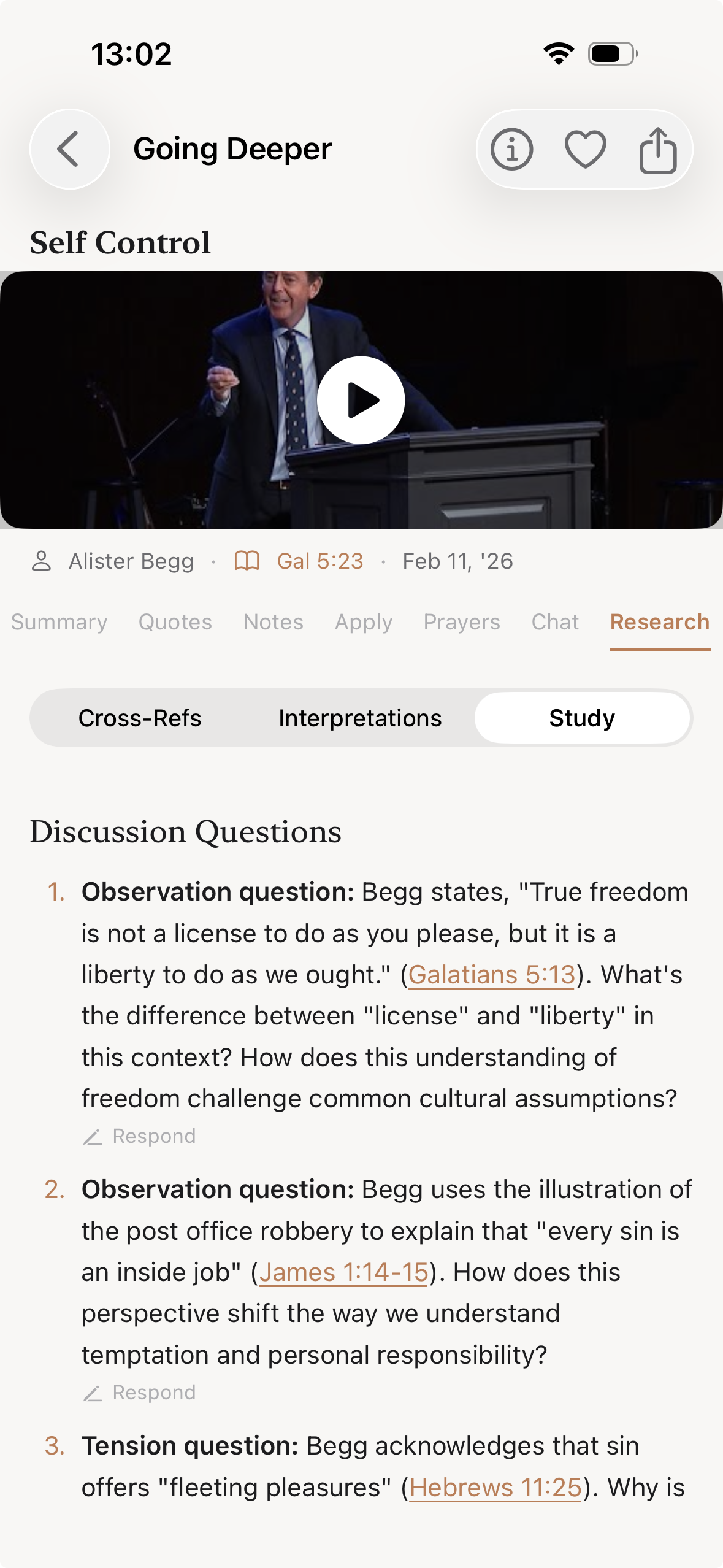 Your transcripts are transformed into structured summaries with key scriptures, cross-references, and theological insights through Going Deeper.